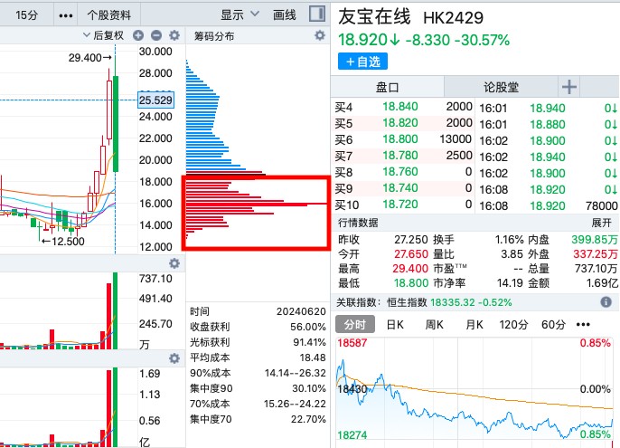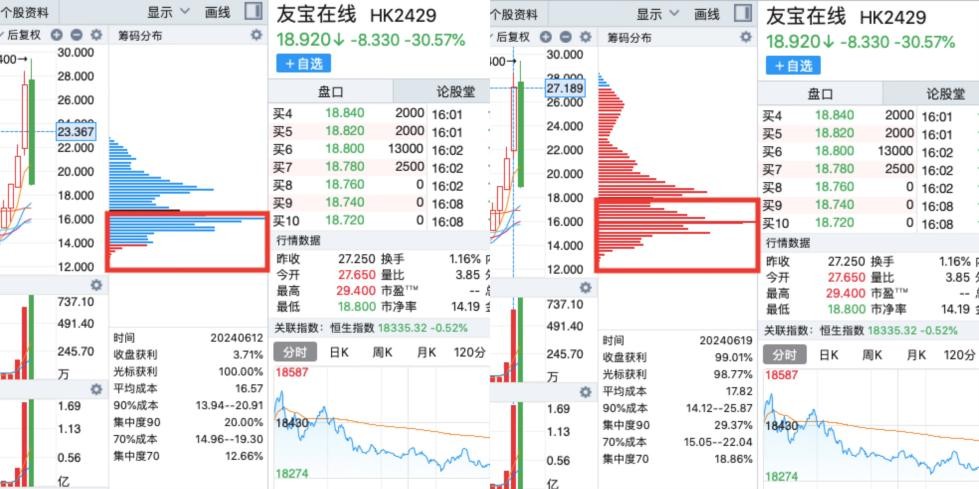 从筹码分布图来看,自6月11日至19日,友宝在线股价从13.6港元涨至27.25元,同时筹码亦从下方的16元集中处开始不断向上移分散,但16元及以下的低位筹码仍大量存在。这也意味着,在股价拉升过程中,主力并未打算完全出货的意思。