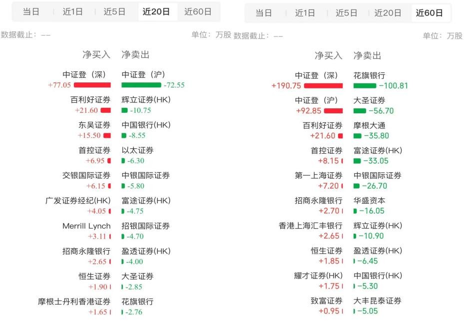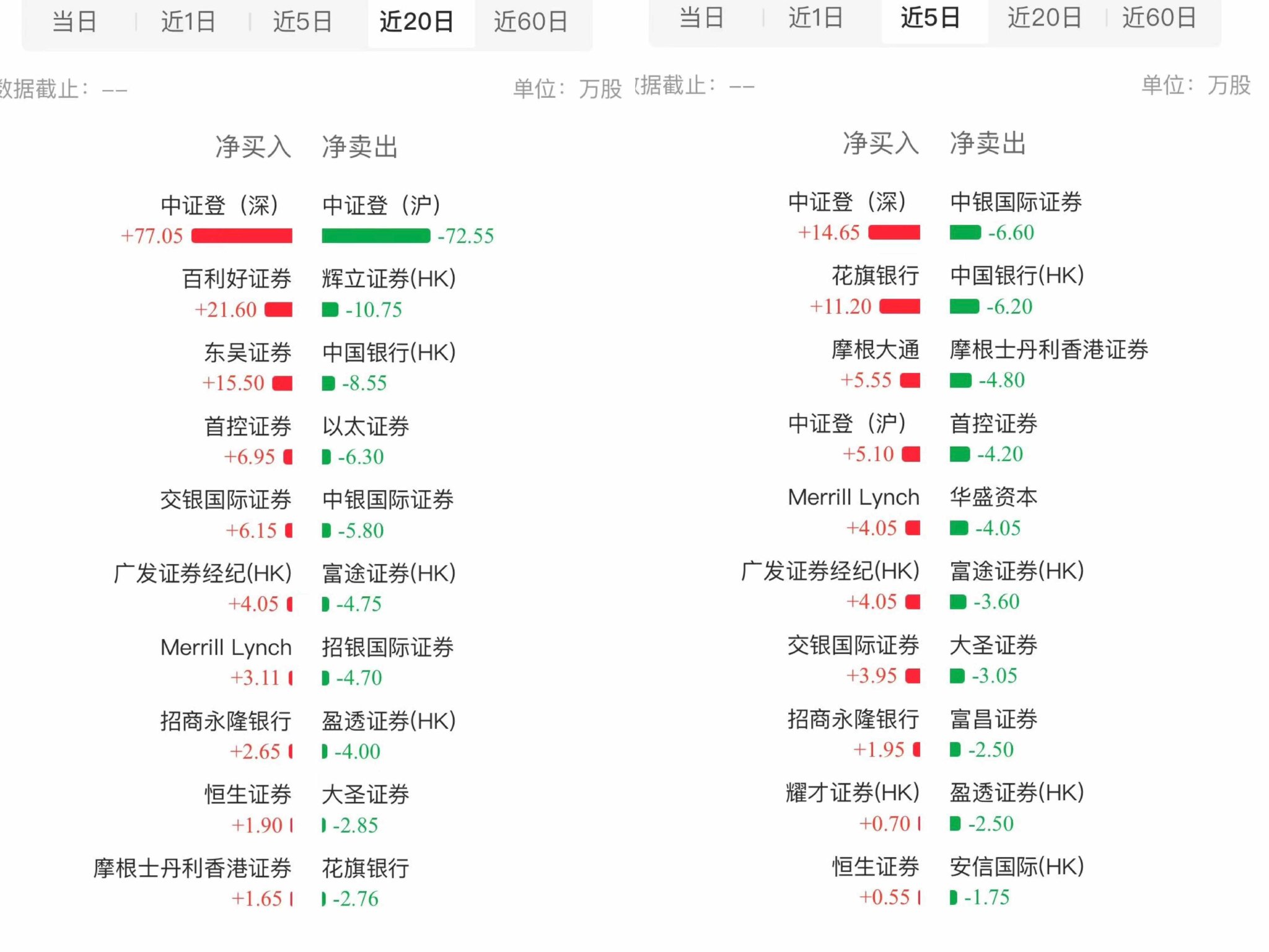 鉴于友宝在线的股价是从6月11日开始上升,脱离超稳定区间。大致可以判定中证登(深)获得的筹码16港元及以下偏多,此后的百利好证券、东吴证券及首控证券要高于这个价格。而近5日买入席位开始变多,新出现了花旗银行、摩根大通、交银国际证券、Merrill Lynch、耀才证券等。可见随着股价抬升,更多机构和散户注意到该股票。值得关注的是,曾作为买方的首控证券,开始卖出部分筹码(420万股)。