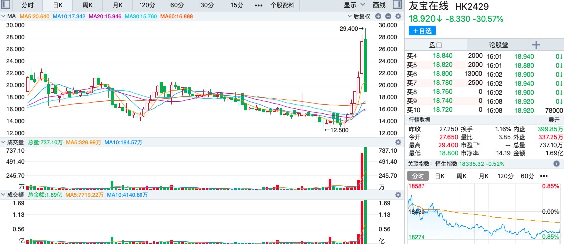 短短几日山东期货配资,友宝在线(02429)股价已上演大起大落的戏码。有6日股价翻倍的高光时刻,也有今日大跌逾30%的落寞。