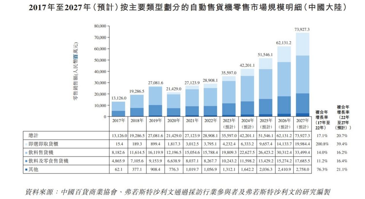 未来,随着技术不断创新让自动售货机便利性的提升以及大众对自动售货机接受程度的不断提高,自动售货机零售市场发展有望进一步加速,规模增长至2027年的739.27亿元,五年复合增速20.7%。显然,弗若斯特沙利文预期疫情过后自动售货机零售市场将迎来加速发展。